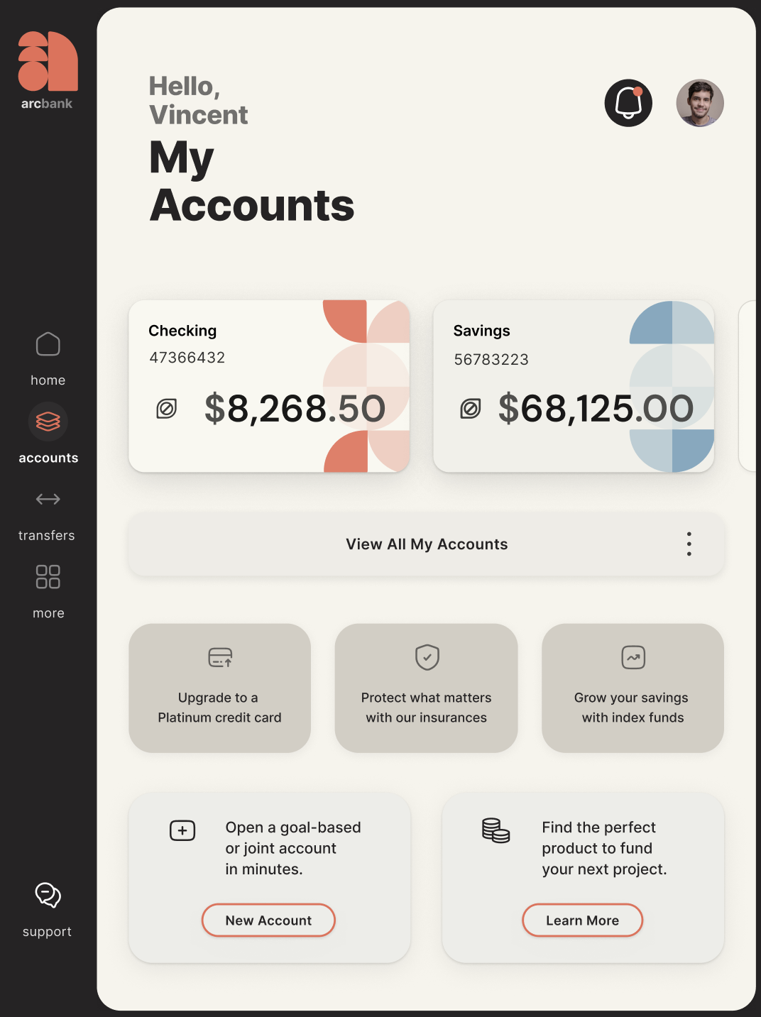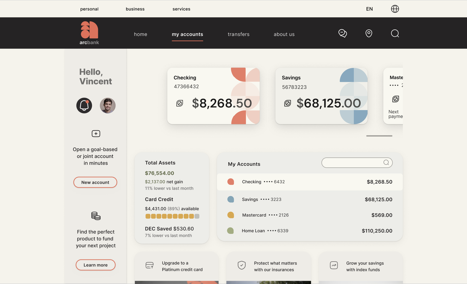 The result is a disjointed experience where users struggle to see the full picture or locate what they need quickly. In ArcBank, the challenge was to design navigation and information architecture that feels natural and predictable, guiding users from the big picture to the details, supporting fast decisions, and reflecting the way people naturally think about money.