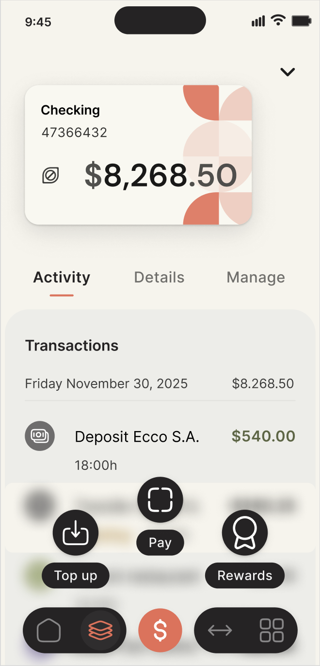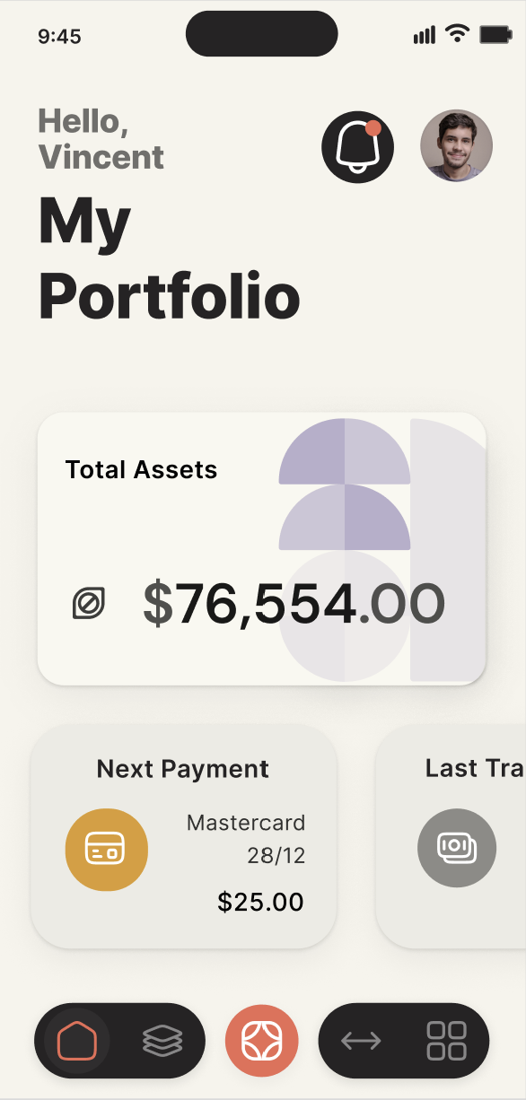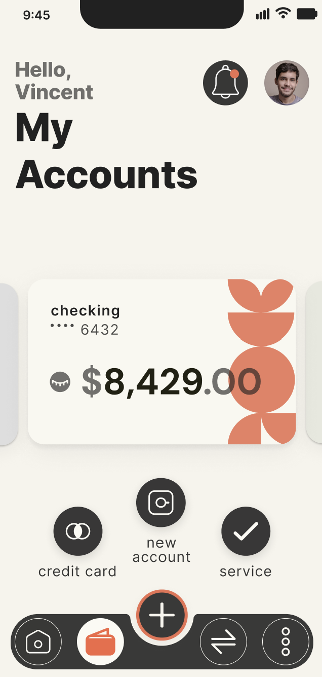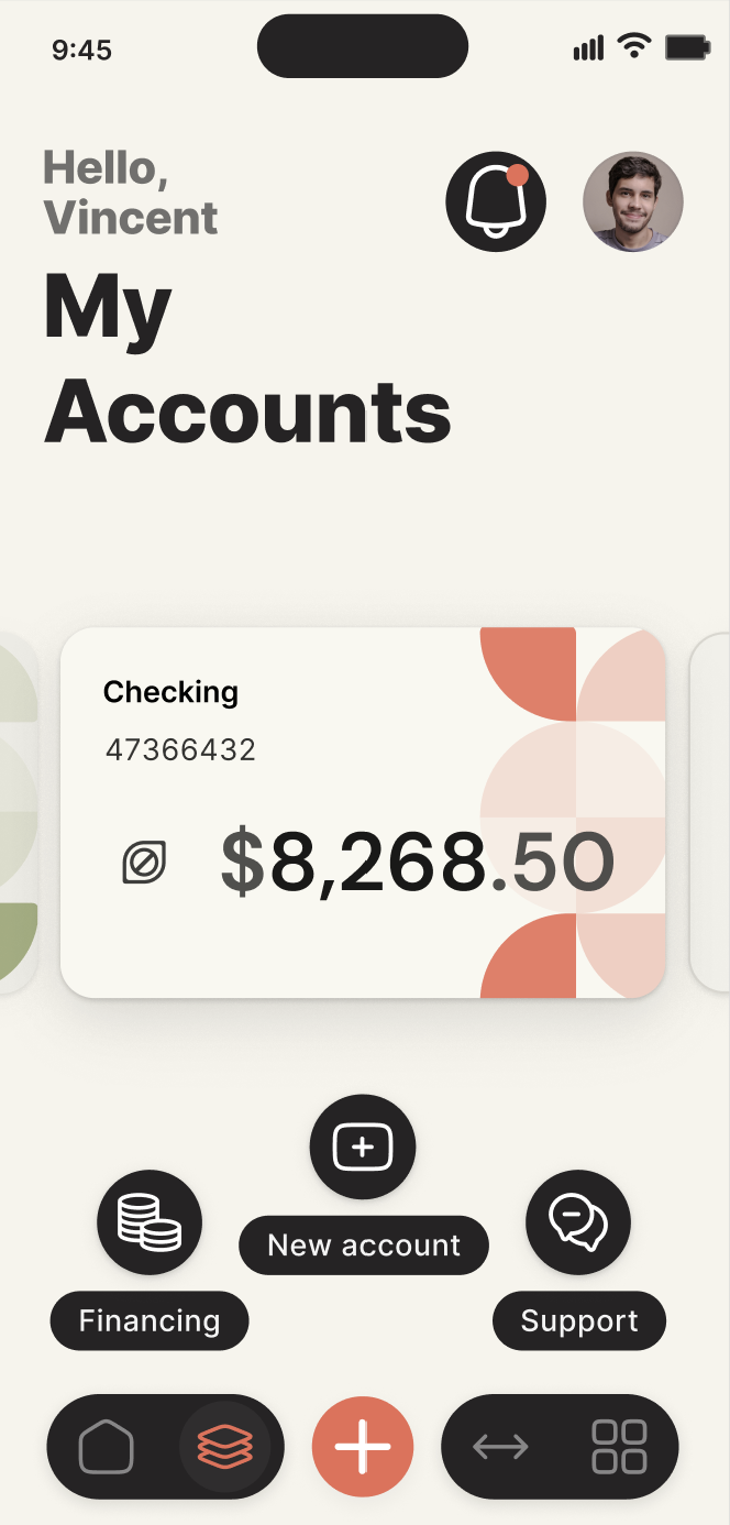 The result is an interface where users can navigate intuitively, complete tasks faster, and see the full scope of their finances at a glance. Floating actions and the hub layout reduce friction, improve discoverability, and make the experience feel fluid, intentional, and human-centered.