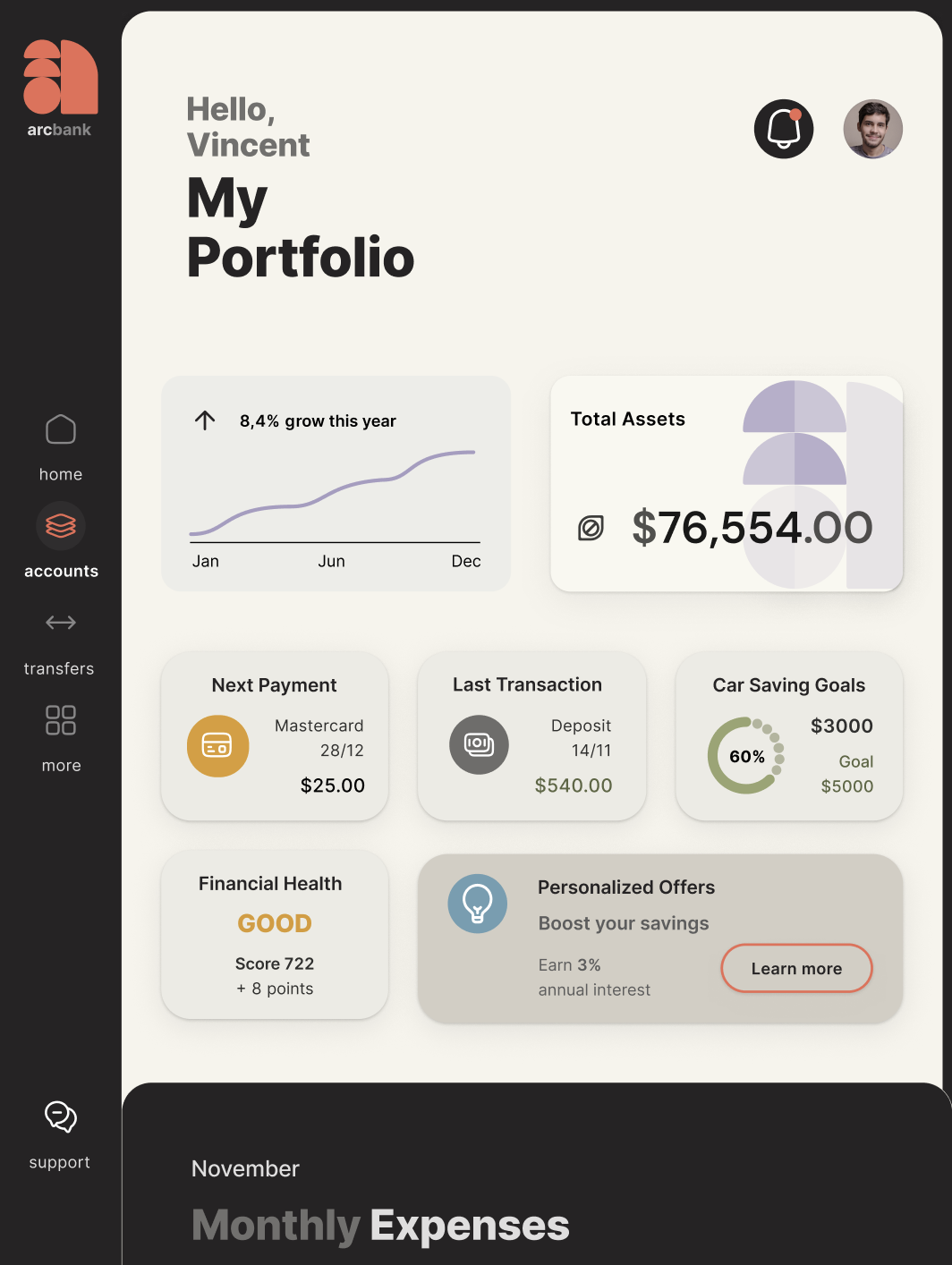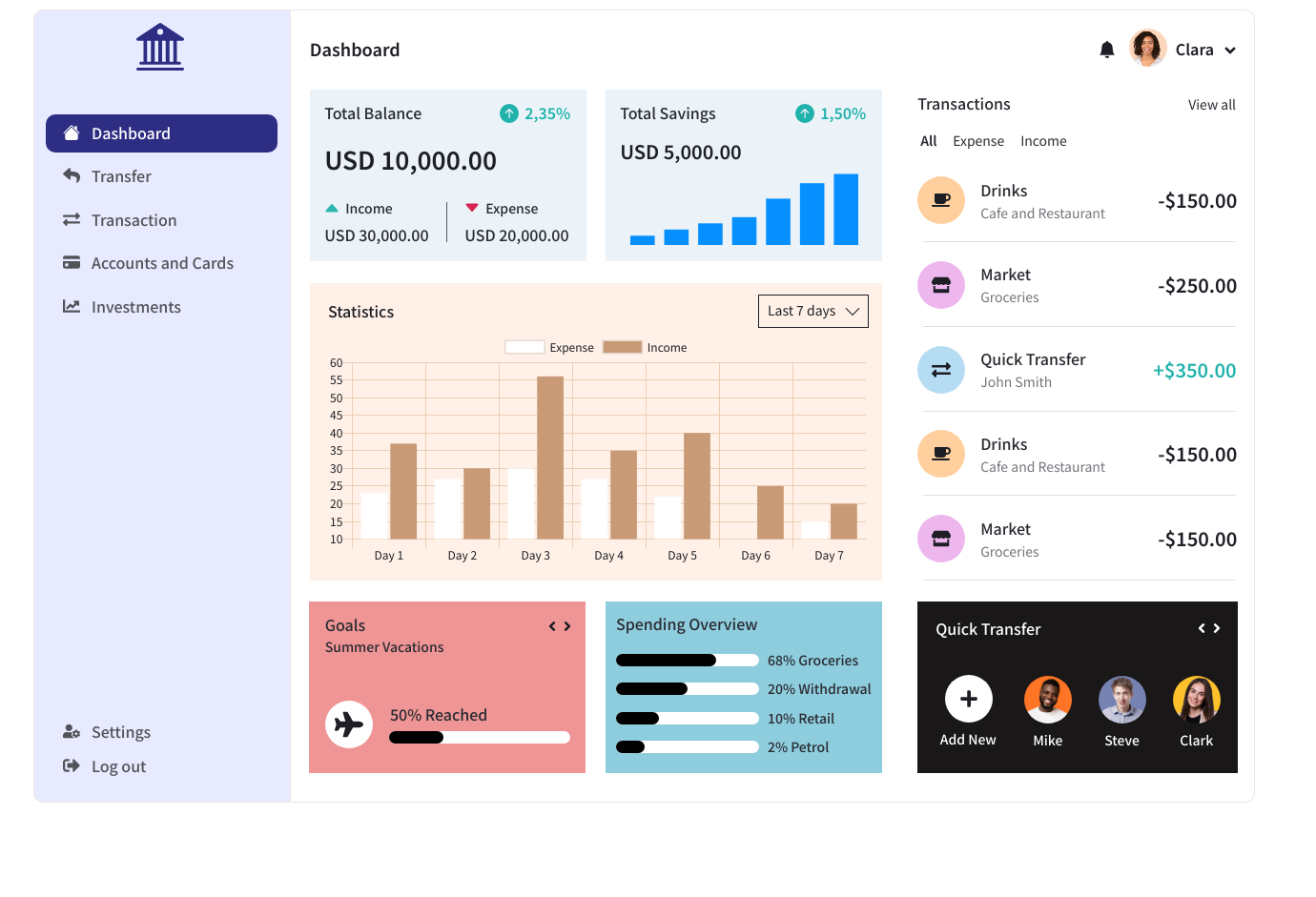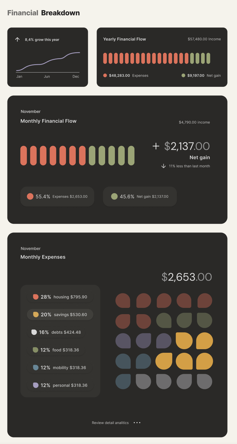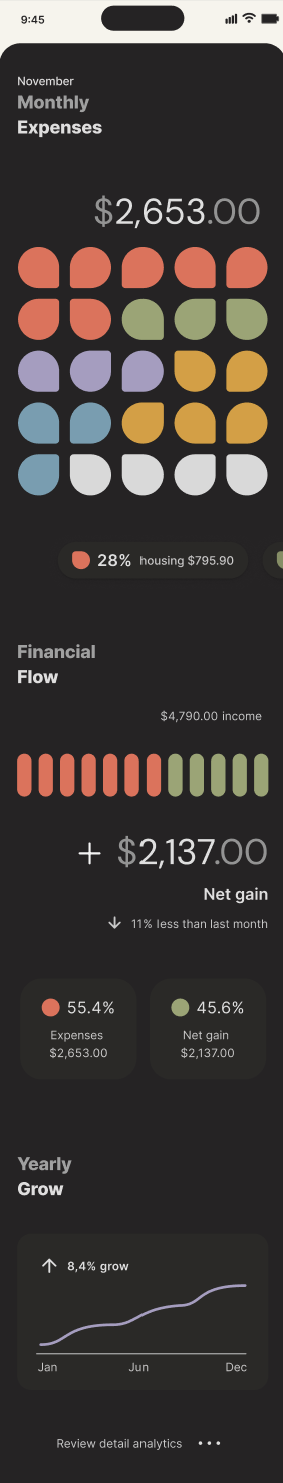 Together, these elements create a visual system that feels structured yet human. By guiding attention and reducing cognitive load, the interface transforms financial management into a calm, confident experience.