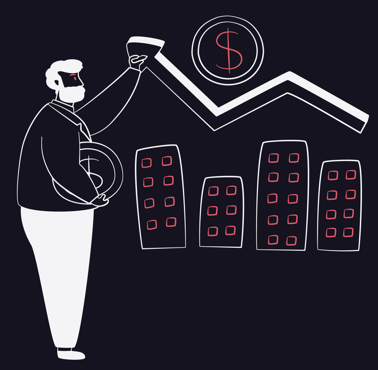 A structured palette is softened with pastels and anchored by a vibrant coral red. Light mode supports everyday actions, while dark mode creates a calmer space for reflection and financial insights.