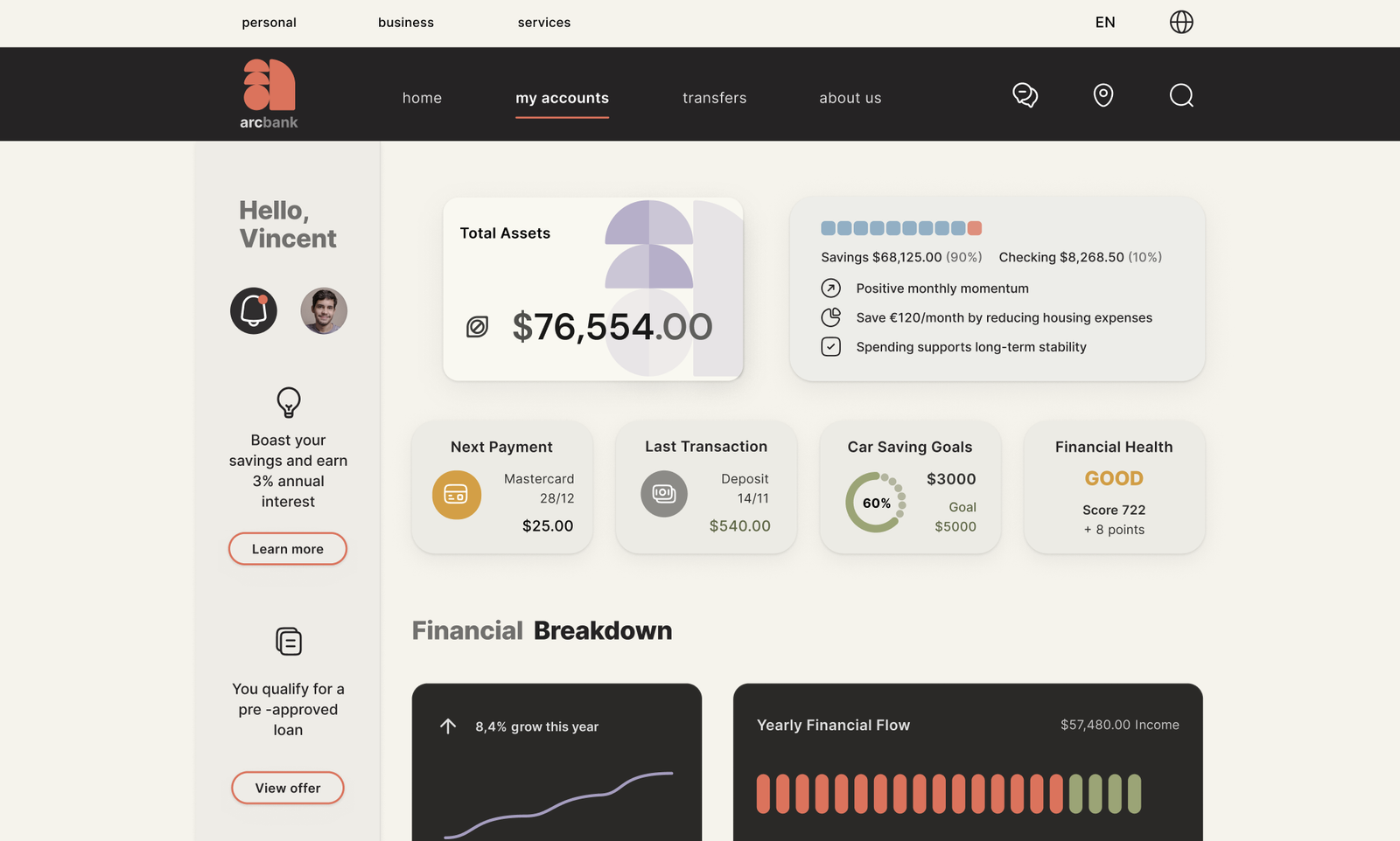 The ArcBank redesign transforms a traditionally rigid banking interface into a clear, structured, and human-centered experience. A cohesive visual system, intuitive navigation, and accessible data visualization help reduce cognitive load and make financial information easier to understand.