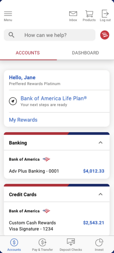 • Accounts: add accounts, financing, and get support