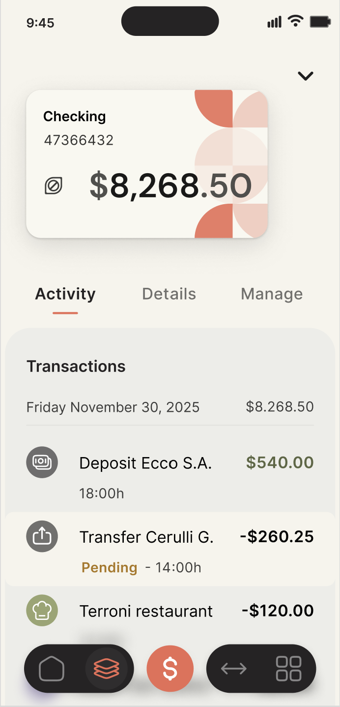 On mobile, a four-anchor navigation model, Home, Accounts, Transfers, and More, creates a simple, memorable structure. Contextual floating action buttons (FABs) surface the most common actions exactly where they’re needed: