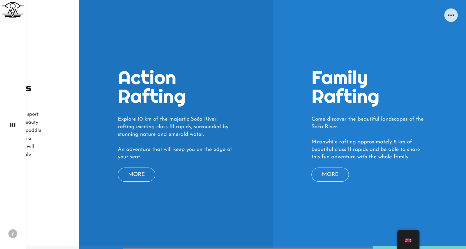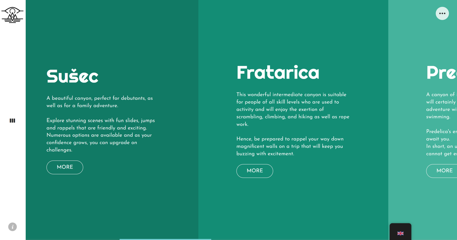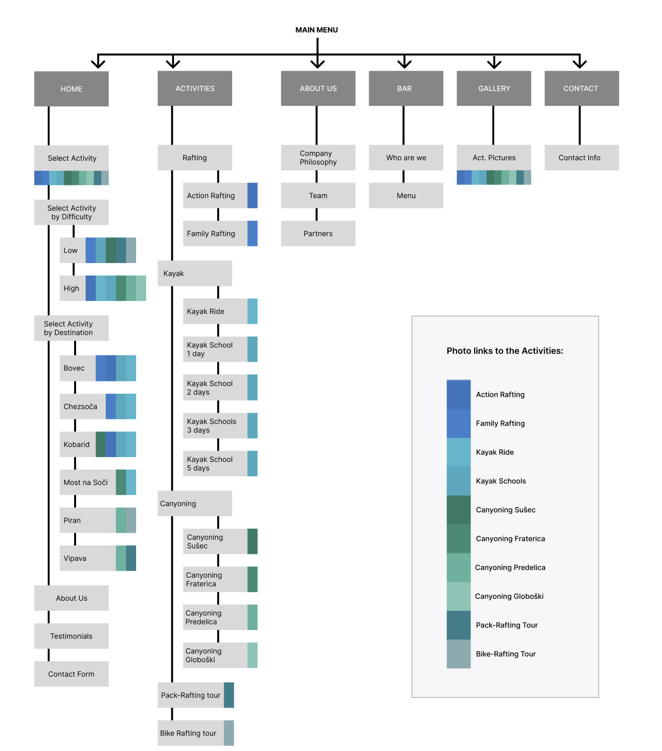 Black and white form the interface’s backbone, while a secondary palette inspired by the Soča River highlights each activity category with distinct colors and tones. Headings in Righteous convey the brand’s adventurous energy, body text in Josefin Sans is easy to read, and numbers in Montserrat clearly show prices, schedules, and key details.