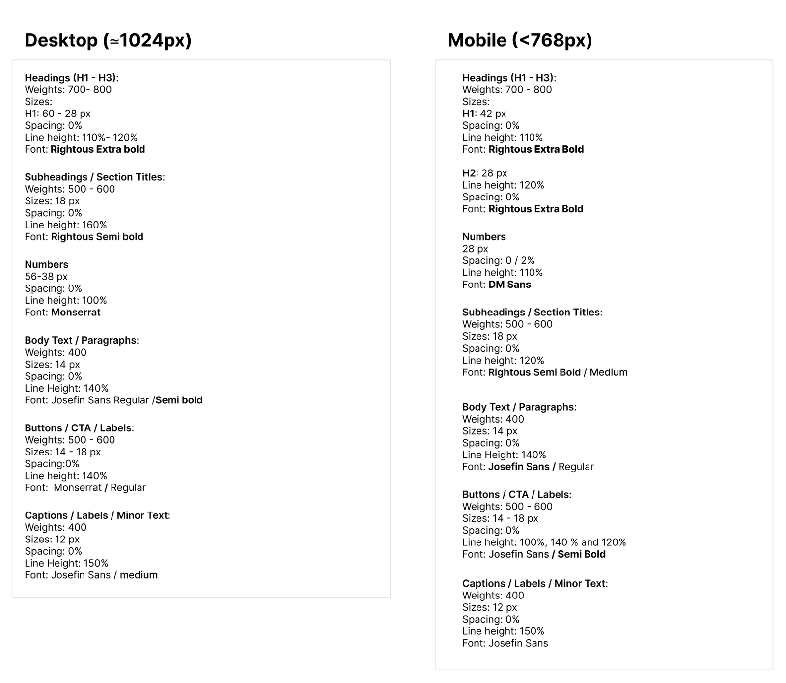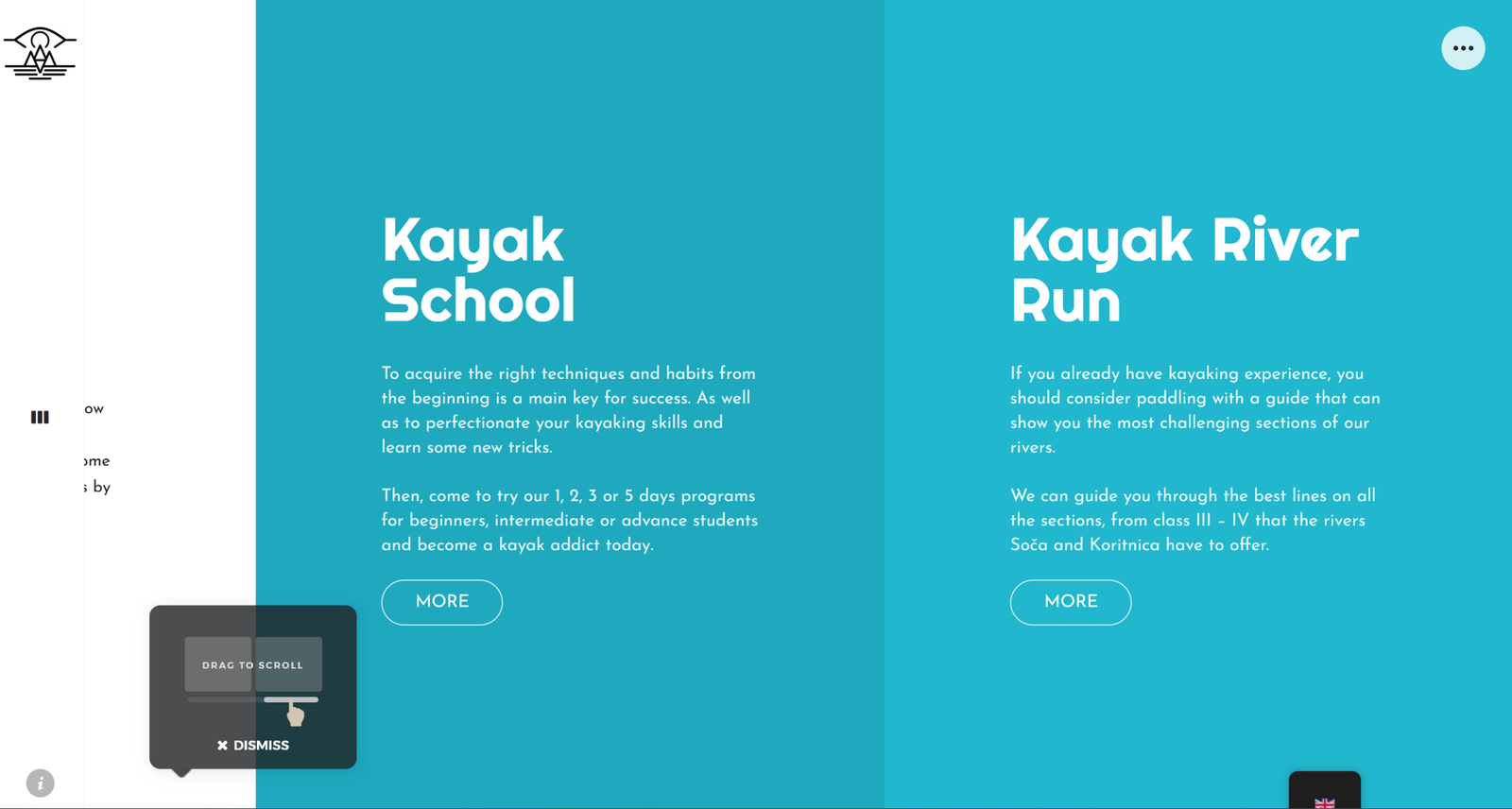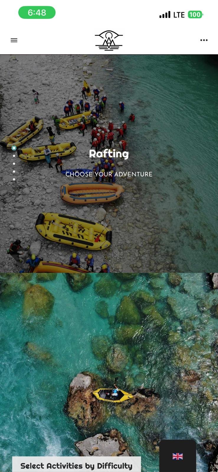 Black and white form the interface’s backbone, while a secondary palette inspired by the Soča River highlights each activity category with distinct colors and tones. Headings in Righteous convey the brand’s adventurous energy, body text in Josefin Sans is easy to read, and numbers in Montserrat clearly show prices, schedules, and key details.