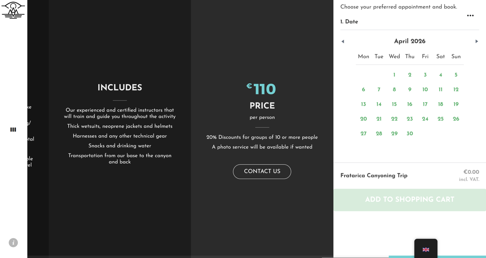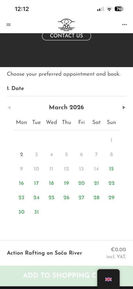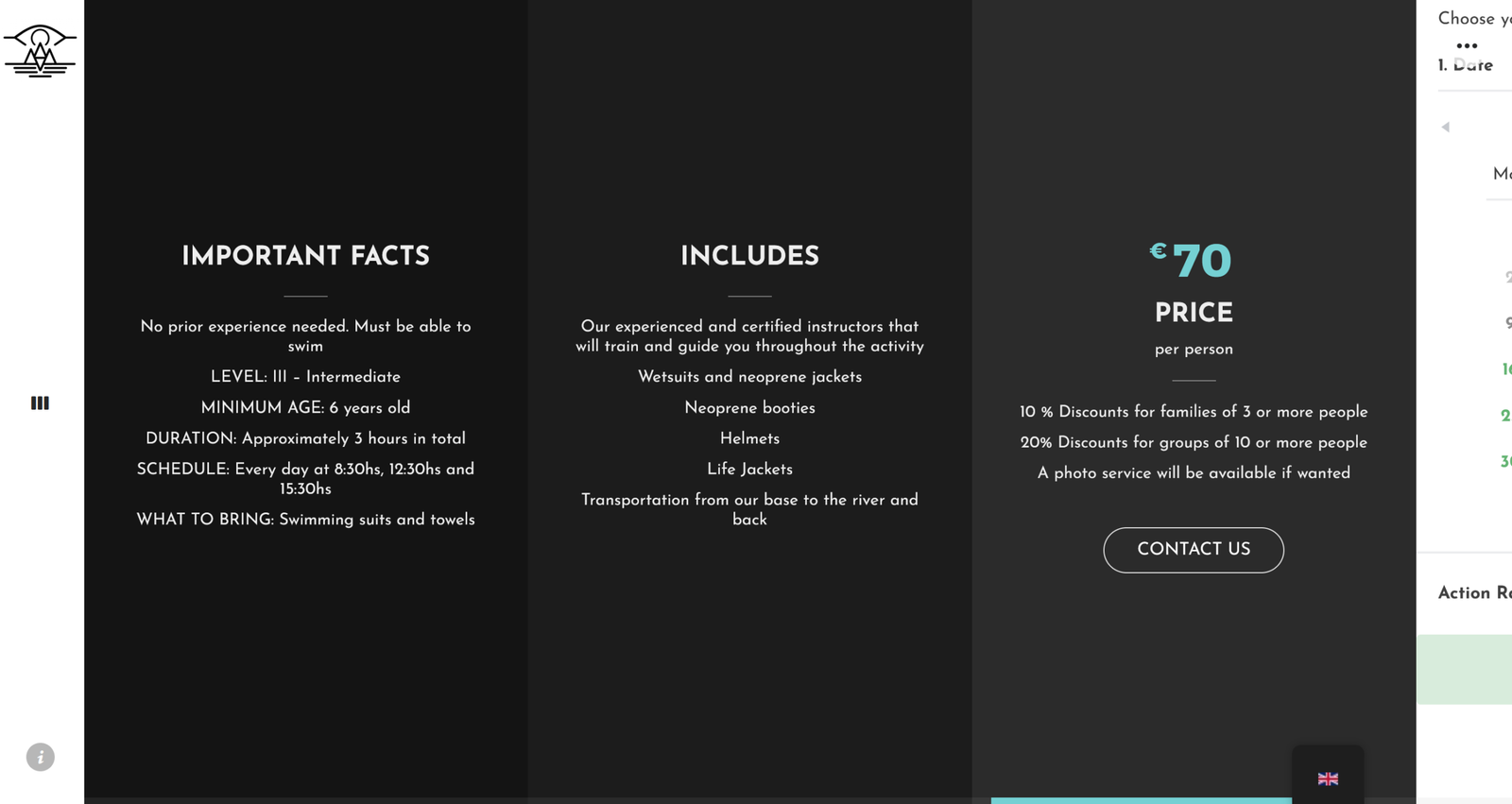 A third-party booking platform was embedded into the activity pages, creating a seamless flow. The user selects the activity, chooses a date and time, confirms participants, and completes payment, all without leaving the site.